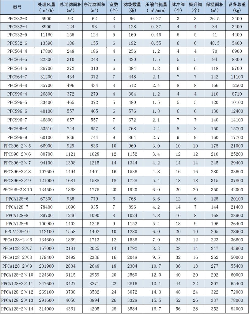 PPC型氣箱脈沖袋式除塵器有四個系列35種規(guī)格。過濾面積93-4361m3,處理風(fēng)量范圍6900-314000m3/h。